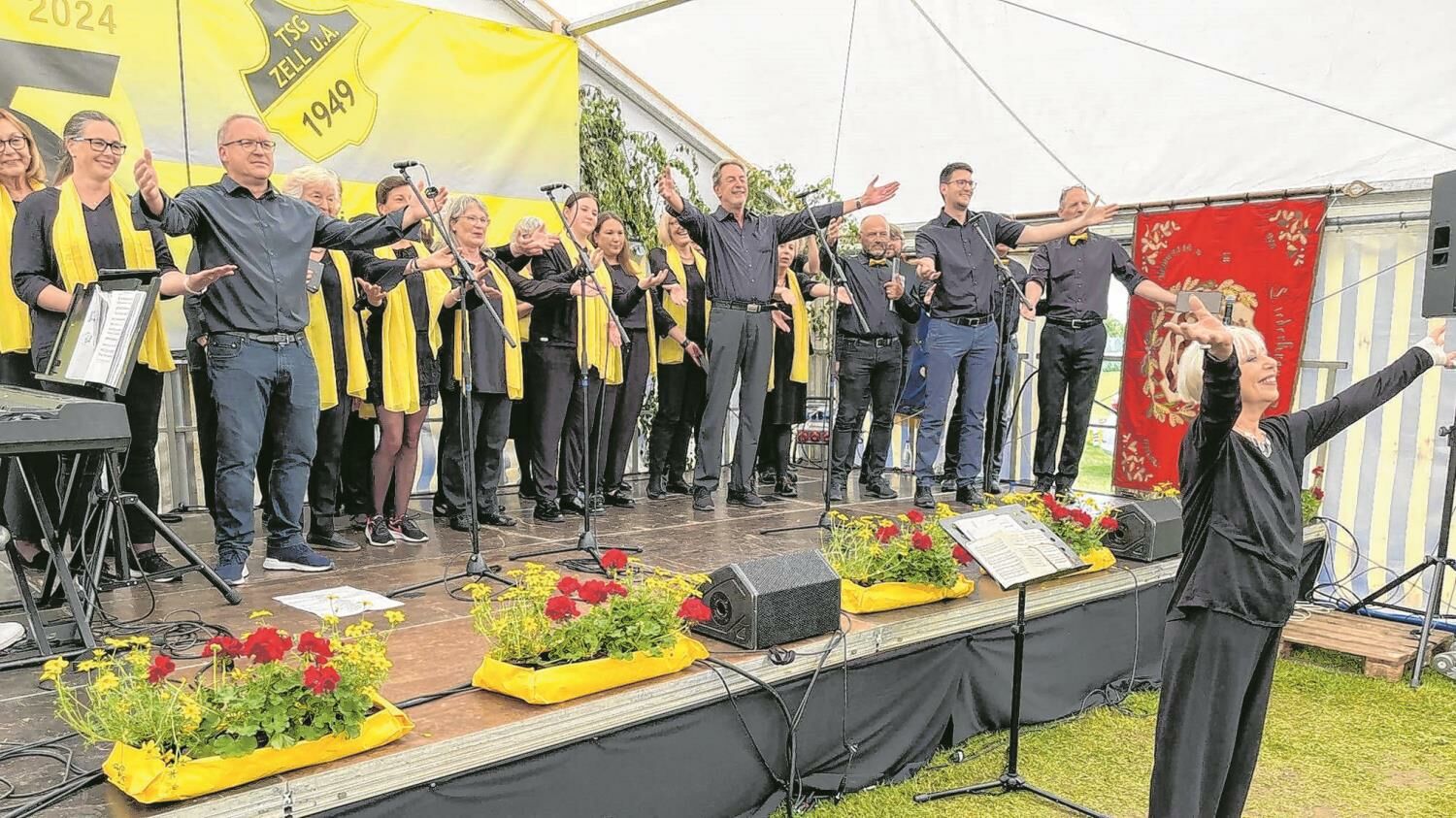 Es war ein musikalischer, fröhlicher und auch berührender Festakt, mit dem der TSG Zell sein 75-jähriges Jubiläum auf dem Zeller Berg feierte. Der Liederkranz des TSG unter Leitung von Gabriele Grabinger legte los mit „Mamma Mia“ und „Dancing Queen“, wurde verstärkt um Bürgermeister Christopher Flik, dem Nachbarschultes Jochen Reutter aus Hattenhofen, wo die Grabingers wohnen, und Zells Altbürgermeister Werner Link, der schon 28 Jahre der 2. Vorsitzende des TSG ist. Am Klavier: Peter Grabinger. Der Liederkranz selbst geht auf das Jahr 1884 zurück. Seit 75 Jahren singt er in den Vereinsfarben schwarz und gelb. Der Vereinsvorsitzende Dierk Kubert, auch schon bald 20 Jahre im Amt, konnte nach dem Auftritt fast nichts drauflegen. „So schön wie ein Konzert.“